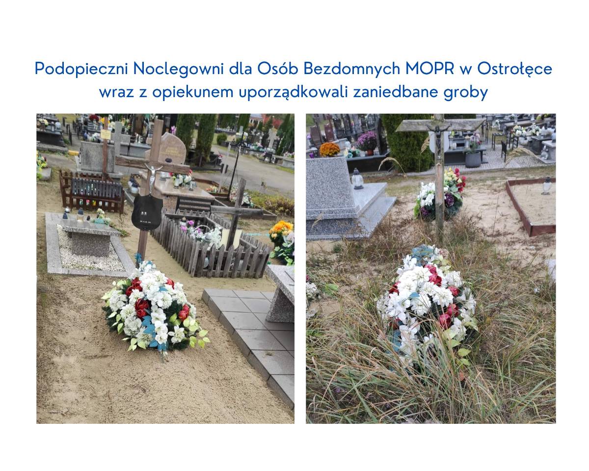 W związku ze zbliżającym się Dniem Wszystkich Świętych w ostatnim tygodniu października osoby bezdomne z Noclegowni dla Osób Bezdomnych MOPR w Ostrołęce wraz z opiekunem uporządkowali zaniedbane groby na cmentarzu komunalnym w Ostrołęce. Dzięki pomocy Męskiej Grupy Różańcowej "Nazaret" wymieniono zniszczone krzyże przy nagrobkach.