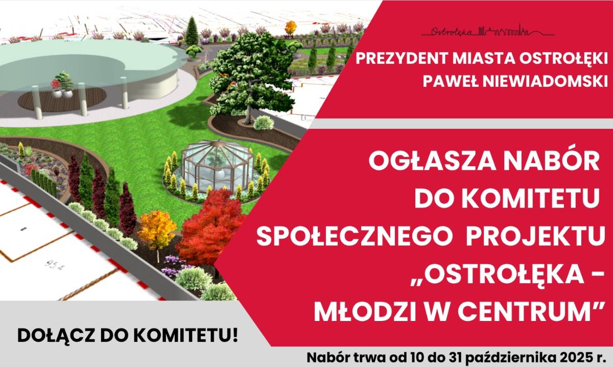 The Mayor of the City of Ostrołęka announces the recruitment of candidates for members of the Social Committee for the project "Ostrołęka – young people in the center". The recruitment of candidates will last from 10 to 31 October 2025, detailed information in the attached documents.